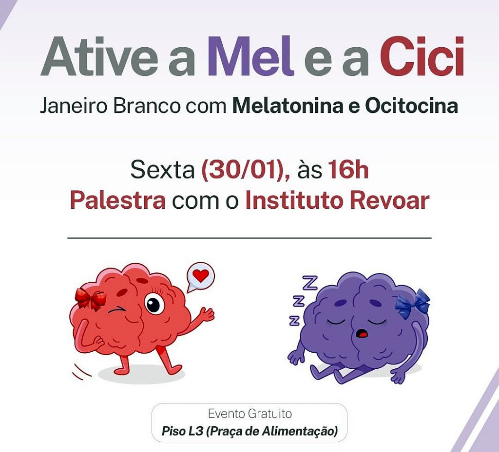 No dia 30, às 16h, será realizada uma palestra com o Instituto Revoar, abordando a importância do cuidado com a saúde mental e o papel de hormônios como a melatonina e a endorfina no equilíbrio emocional.